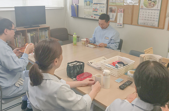 休憩室でワイワイ楽しく食事